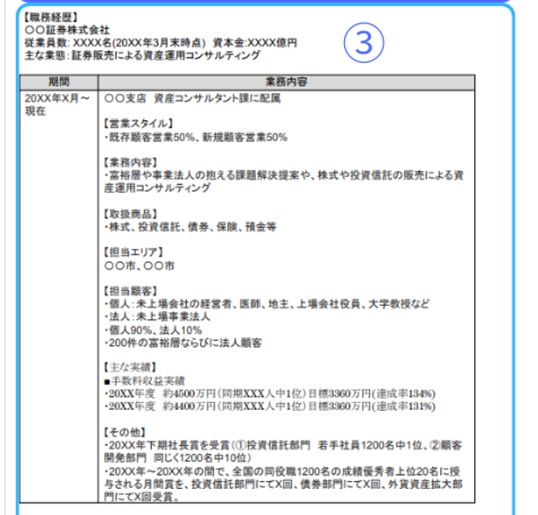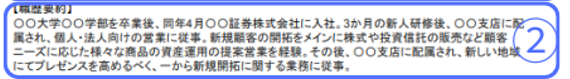 「〇〇大学を卒業後、〇〇証券株式会社に入社。〇〇支店に配属され、個人・法人向けの営業に従事。新規顧客の開拓をメインに株式や投資信託の販売など顧客ニーズに応じた様々な商品の資産運用の提案営業を経験。その後、〇〇支店への異動を経て、未開拓エリアにおけるシェア拡大を担った。」