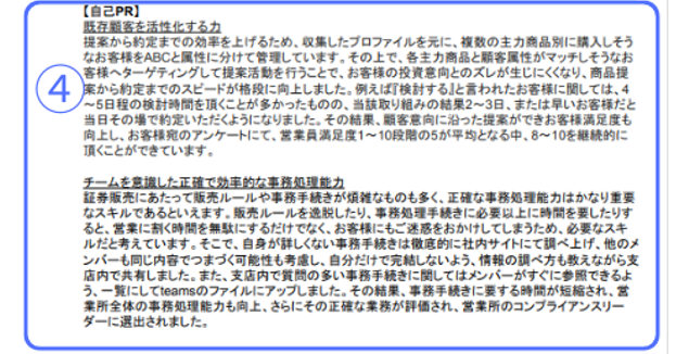 例えば、日々の顧客訪問の業務であれば、「1日10件以上のアポ取りを行い、週30件の訪問を継続した。顧客のポートフォリオを把握したうえで個別提案を実施した」と記載します。これにより、行動と分析力の両方を伝えることができます。
